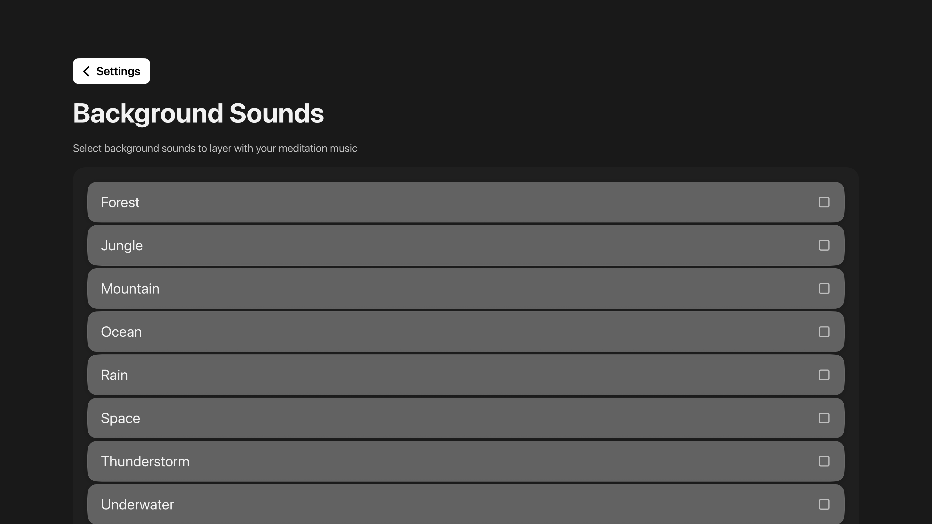 Built-in soundscapes, chimes, singing bowls, or optional Apple Music.