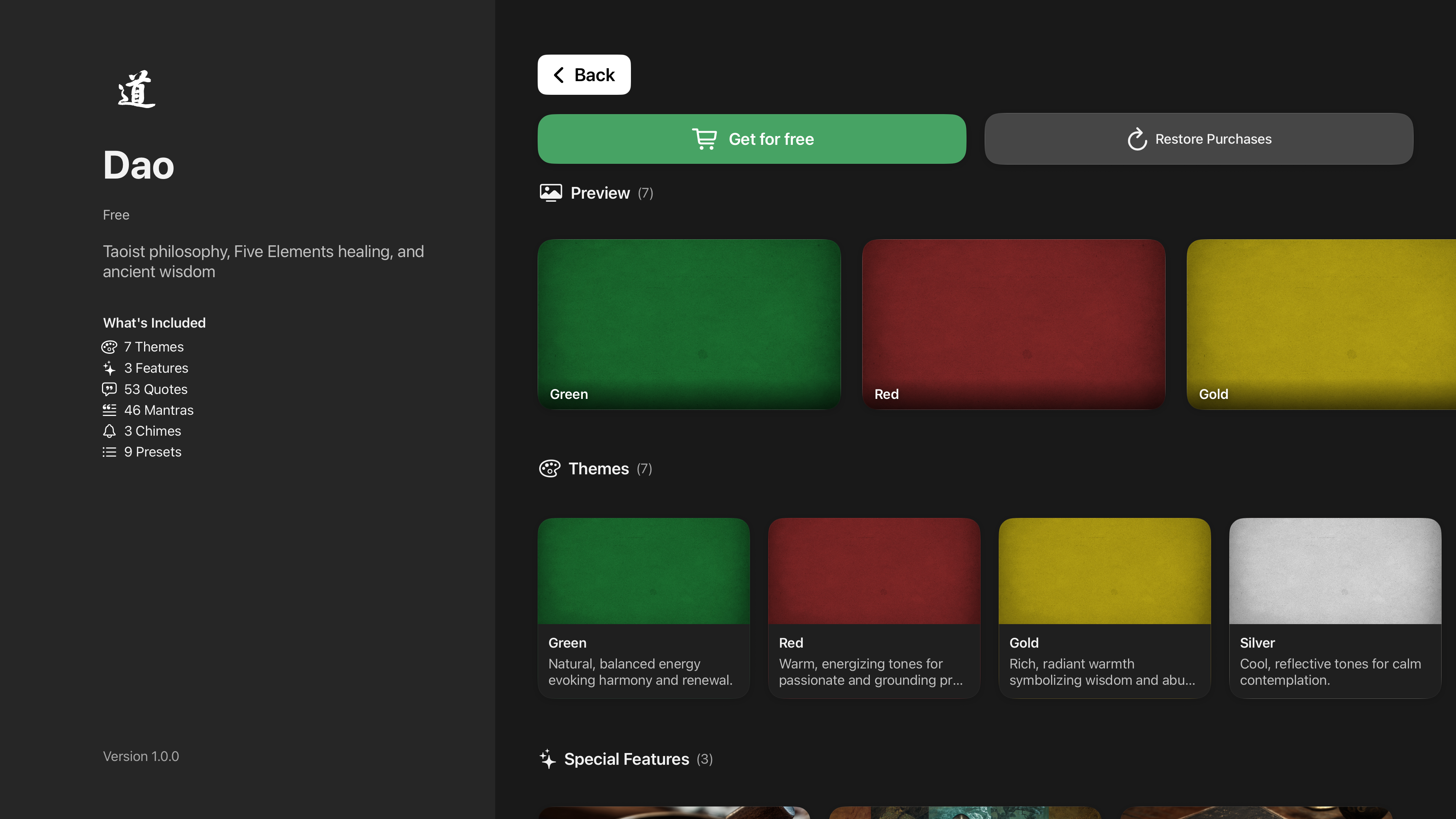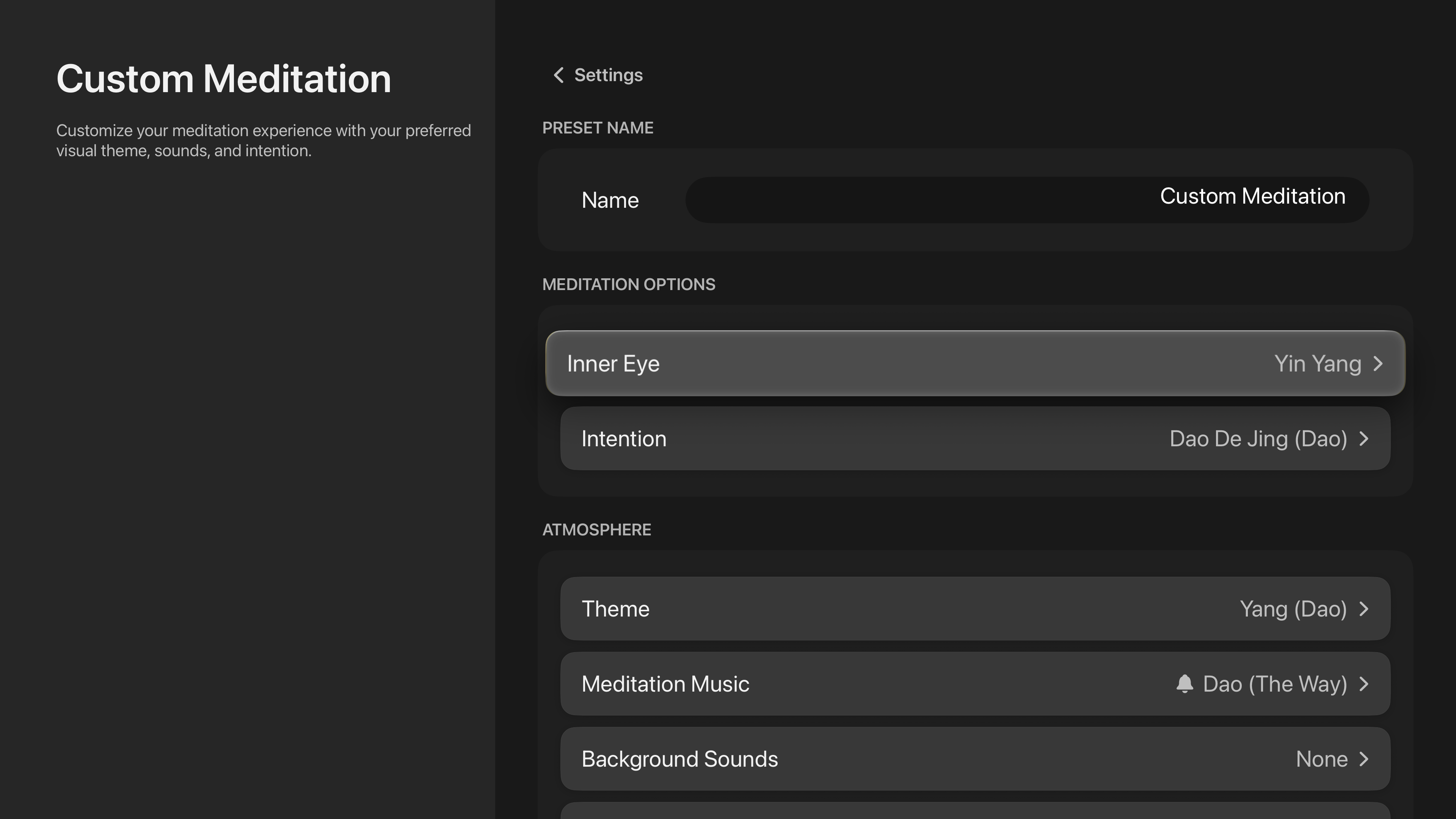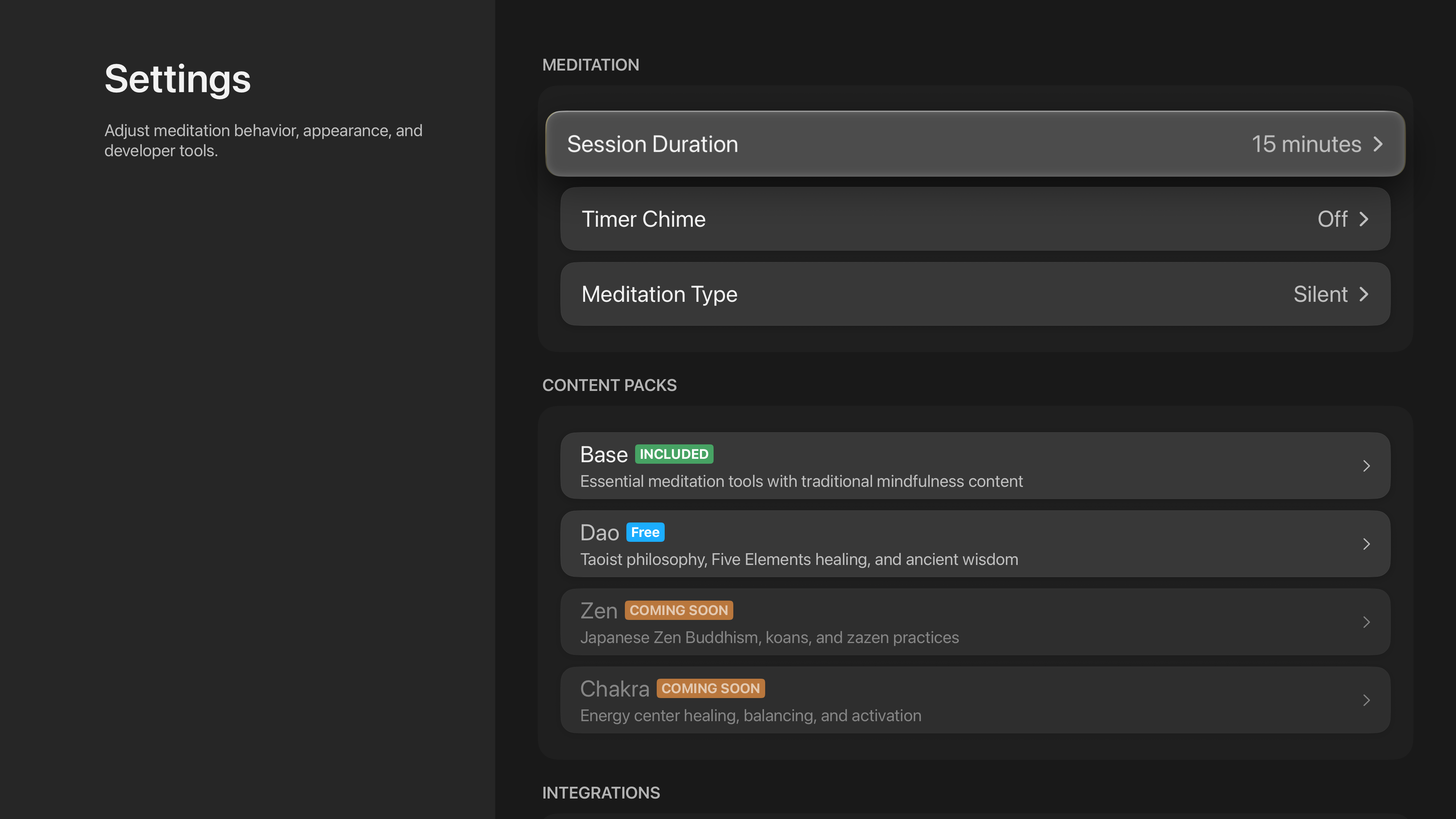 Amazing meditations in the base pack. Extend not just the visuals—sounds, intentions, and themed practices—by adding Dao, Zen, or Chakra packs for a minimal fee.