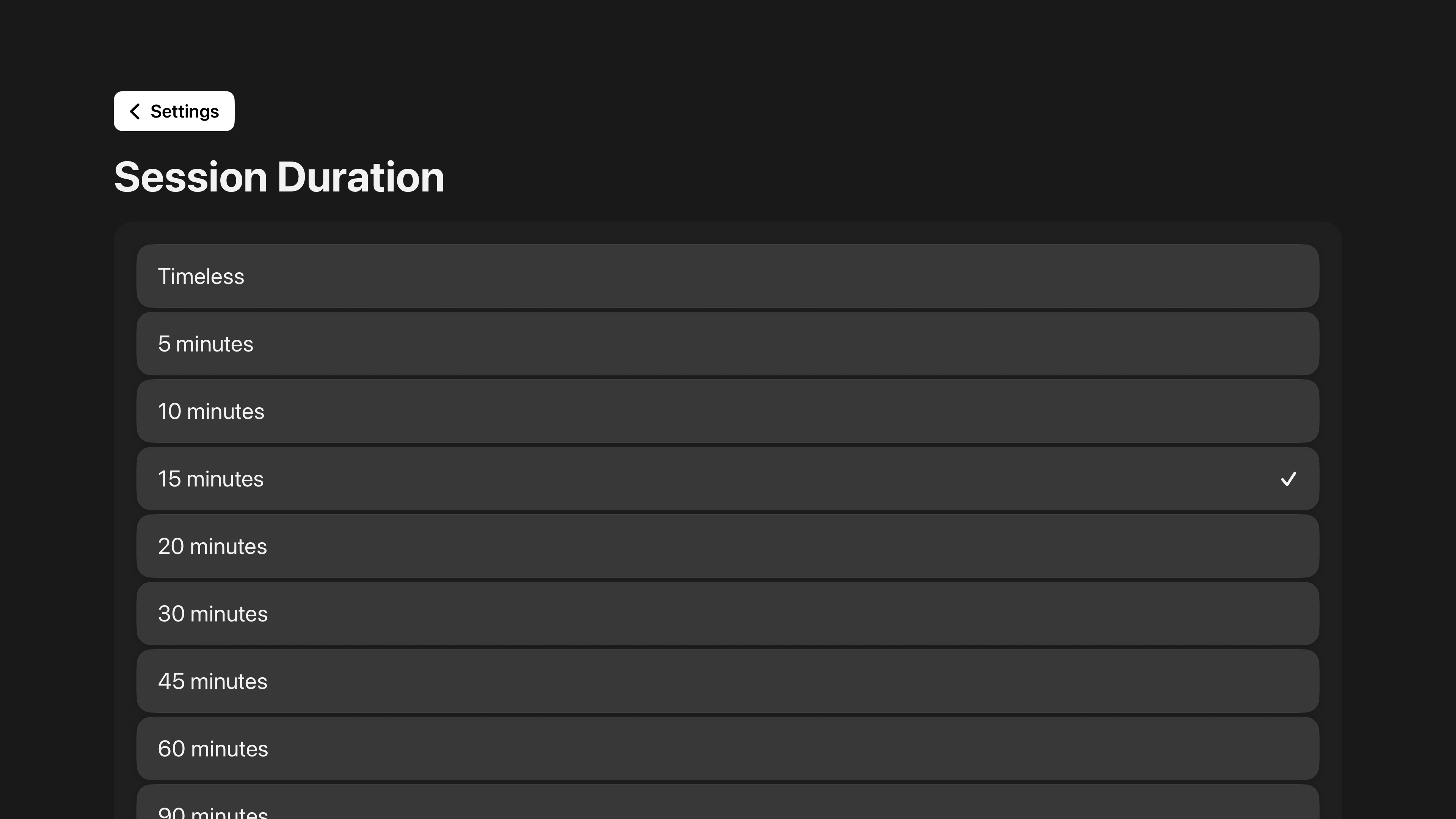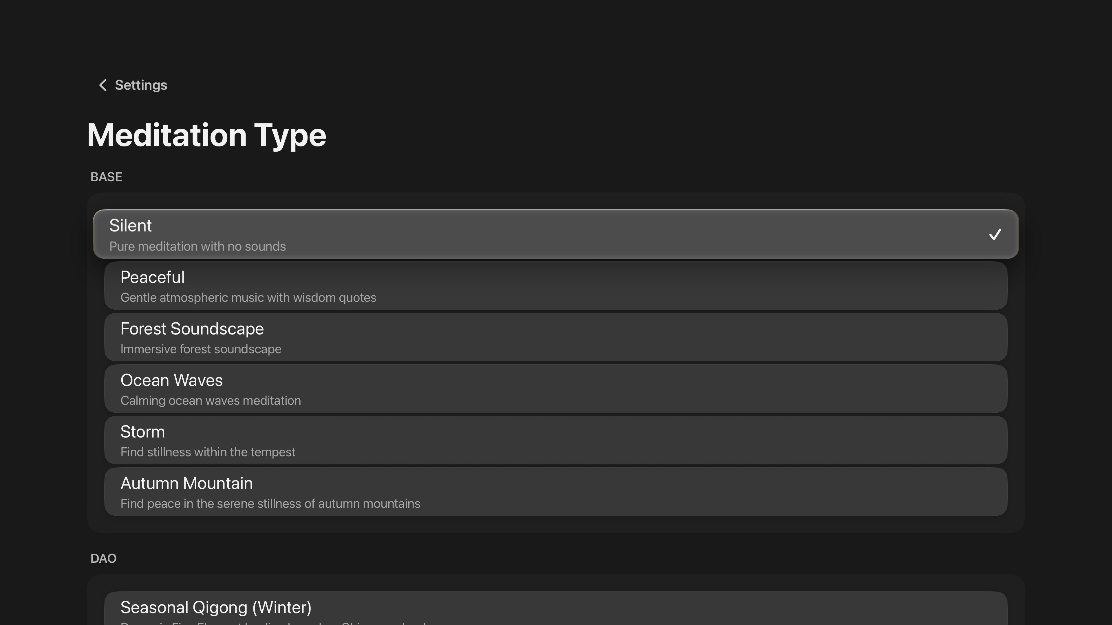 Choose a meditation style—Silent, Forest Soundscape, Ocean Waves, and more.